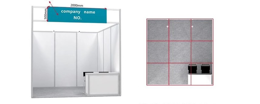 9sqm include:Carpeting, Reception table*1,Chair*2,100W spotlight*2,Waste basket*1, Fascia*1, 220V socket*1. Outside 2.5mH system made.